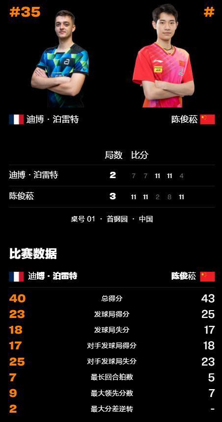 拿下首局的陈俊菘,在第二局打得愈加闲静,何况吸取了上一局末迪博·泊雷特聚会拿分时的警告,盯住了敌手突击直线的迫切,上来就连得2分,在敌手靠强行格杀摧毁这一局的得分荒之后,陈俊菘再度发力,在中局阶段将超越的上风扩大到了8-3,在迪博·泊雷特将比分哀悼6-8时,陈俊菘飘摇叫暂停治疗,重返赛场后一波流以11-7再下一城。