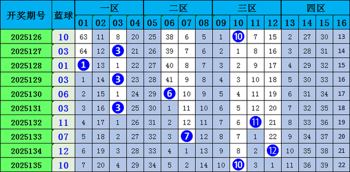 三区定位分析:(在本文中遗漏值3以内的红球为热号,遗漏值4-9之间的红球为温号,遗漏值9以上的红球为冷号。蓝球热号遗漏值在5以内,温号遗漏值在6-15之间,冷号遗漏值在15以上。)