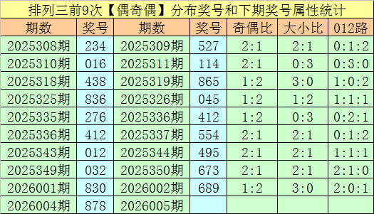 摆设三第2026004期奖号为878,直选奇偶漫衍为:偶奇偶,该奇偶漫衍历史上共出现了984次,前100期出现20次。